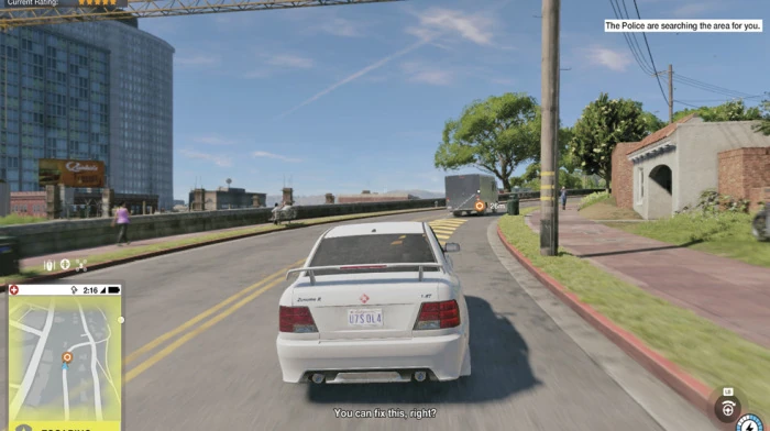 Pick up the client, who seems to be having some career trouble, and listen in on the conversation as the player drives out of Blume Arena.