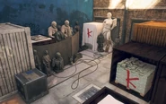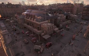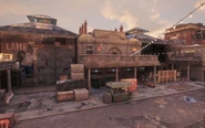 The market building is divide into the two market halls, closed off with protective fences. The southern hall contains the ETO safe (accessing it requires first activating the closed circuit terminal on the other end or throwing the spiderbot up through the scaffolding). The tech point bundle is located on the northern end, and requires throwing a spider bot up behind the wooden divider. Finally, the southern face has a Paste-Up opportunity.