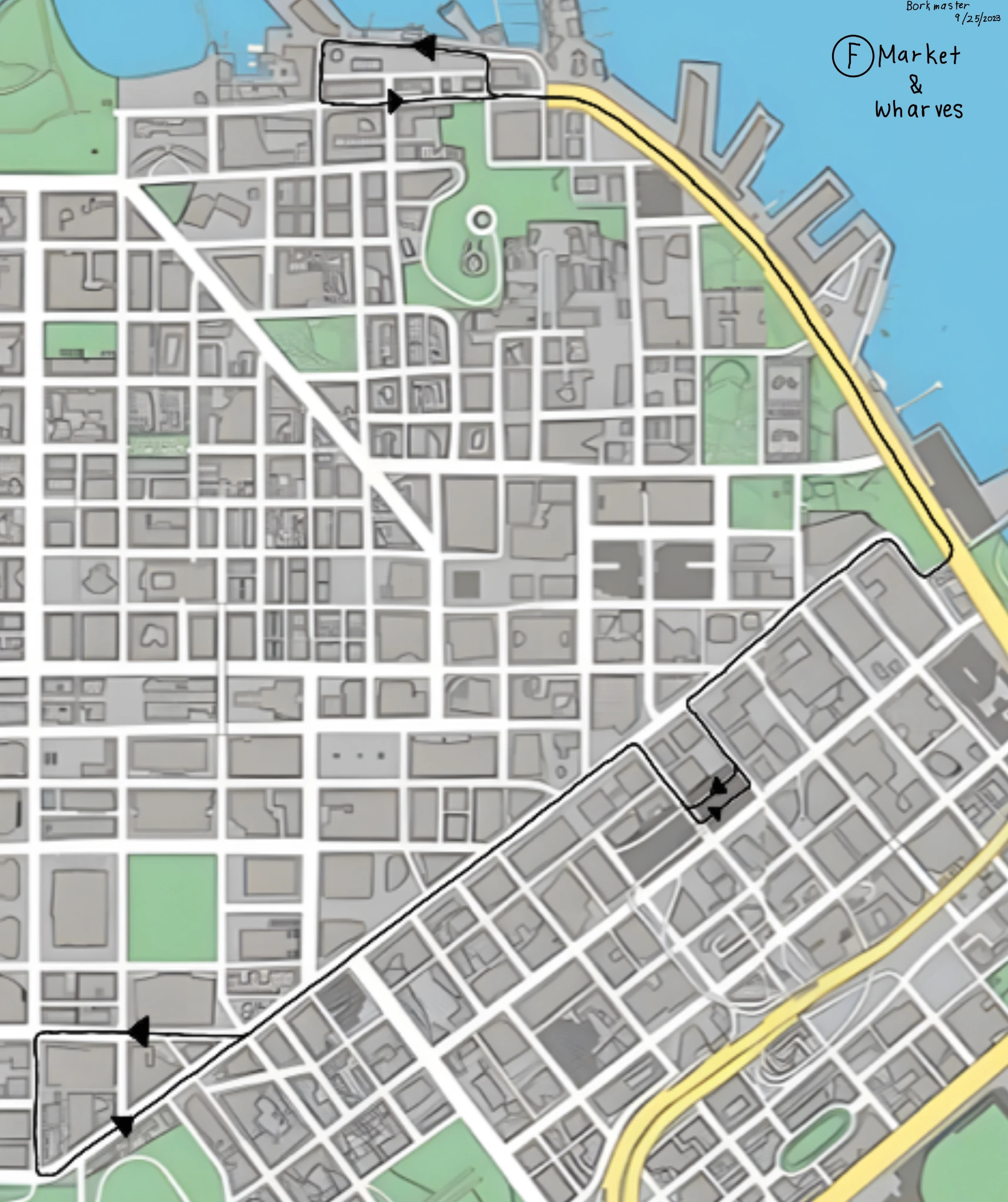 The F Line starts at Fisherman's Wharf, running with the E Line before splitting up at the Ferry Building and ending at Castro before looping back up on Market. Unlike the E line, the avenue consists two lanes in each direction. Rather than Streetcar Lanes, the left lane is a bus lane, although traffic besides buses and coaches tend to drive on it. Streetcars are common in the area, either alone or in pairs travelling in either direction on the bus lanes.